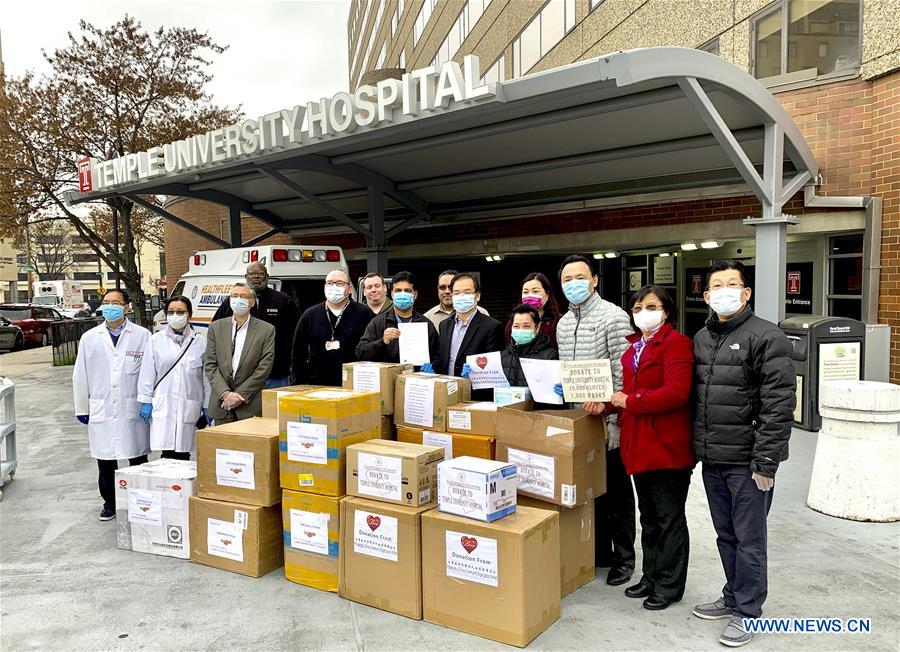 Uma foto dos membros da Organiza??o Comunitária Unida Chinesa de Filadélfia e da Associa??o Fujian de Filadélfia com os médicos depois de entregar os suprimentos médicos doados ao Hospital da Universidade Temple em Filadélfia, EUA, em 30 de mar?o de 2020.
