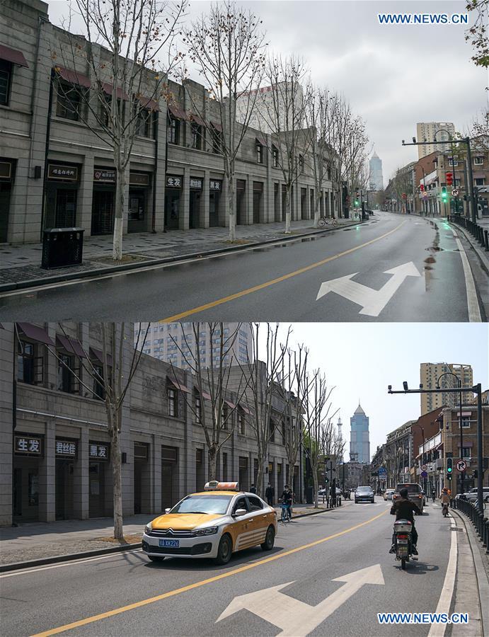 Foto mostra a Avenida Zhongshan em Wuhan, província de Hubei, no centro da China, em 26 de janeiro de 2020 (em cima) e em 8 de abril de 2020.