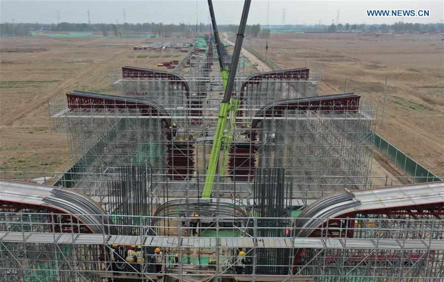 A foto aérea tirada em 9 de abril mostra pessoas trabalhando no canteiro da obra da grande ponte Langouwa da autoestrada Beijing-Xiong’an, na Nova área de Xiong’an, província de Hebei, no norte da China. A autoestrada Beijing-Xiong’an, que liga a Beijing e a Nova área Xiong’an, localizada a cerca de 100 km a sudoeste de Beijing, está em constru??o e abrirá ao transito em 2021.