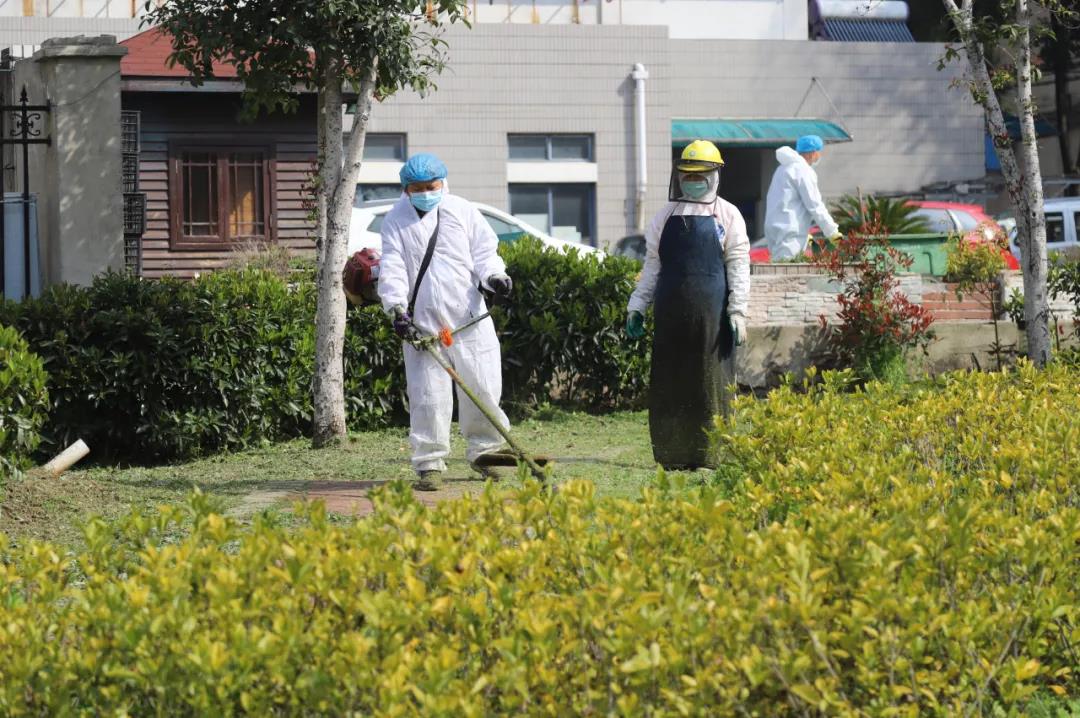 Trabalhadores cortam a grama na Universidade de Geociências da China.