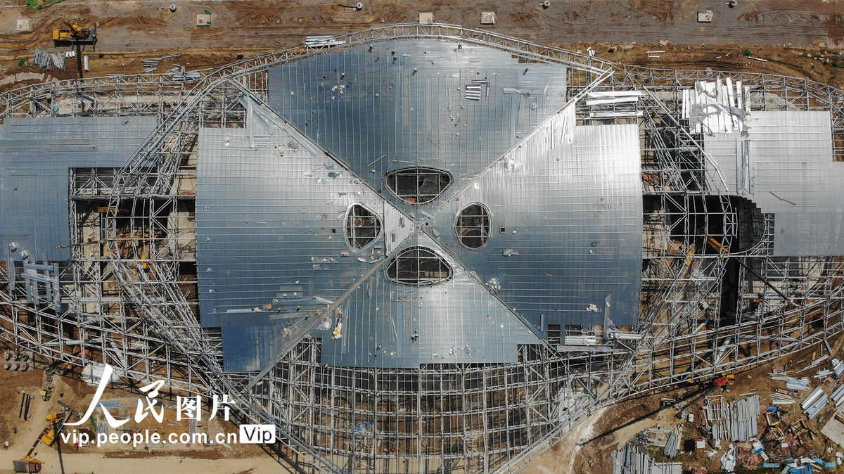 Em 13 de abril de 2020, os trabalhadores est?o trabalhando no telhado do terminal no Aeroporto de Jingzhou.