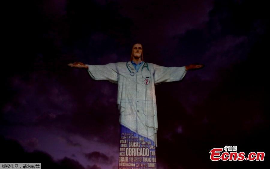 A estátua do Cristo Redentor é iluminada com a imagem de um médico e a palavra "obrigado" em diferentes idiomas.