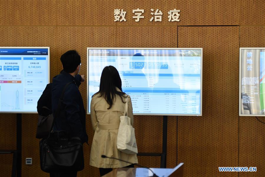 Pessoas visitam o Centro de Comando da Opera??o Cérebro da Cidade em Hangzhou, província de Zhejiang, no leste da China, em 13 de abril de 2020.