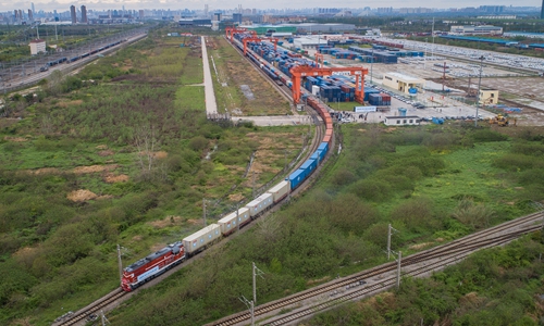 Um trem de carga China-Europa com destino a Duisburgo, na Alemanha sai do terminal de Wuhan da China Railway Intermodal em Wuhan, província de Hubei, centro da China, em 28 de mar?o de 2020. Foto: Xinhua