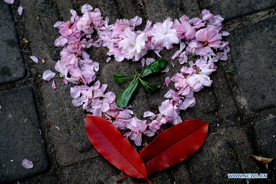 Pétalas de flores de cerejeira, colocadas em forma de cora??o, nas ruas de Shanghai, no leste da China.