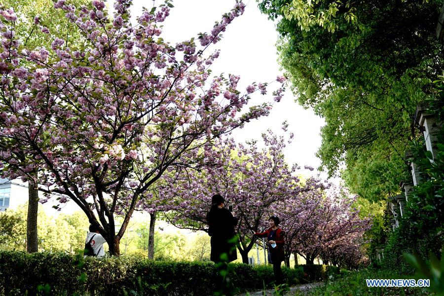 Pessoas caminham na rua coberta por pétalas de flores de cerejeira em Shanghai, no leste da China, em 15 de abril de 2020. As Pétalas foram deixadas no ch?o intencionalmente para decorar a cidade.