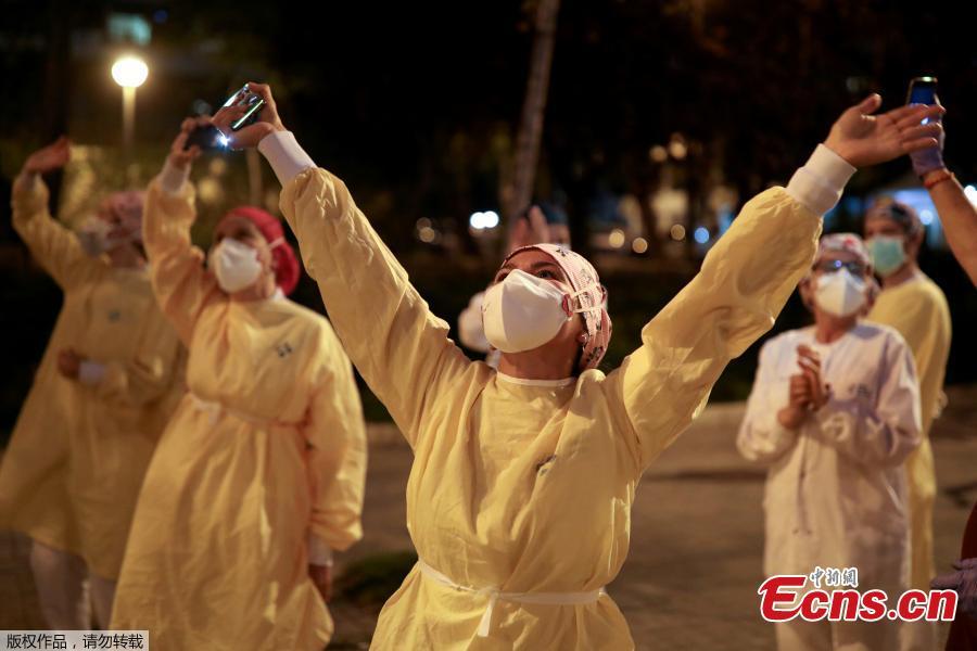 Profissionais de saúde com roupas de prote??o responderam aos cidad?os que mostraram o seu apoio nas varandas e janelas de Barcelona, Espanha, 15 de abril de 2020.