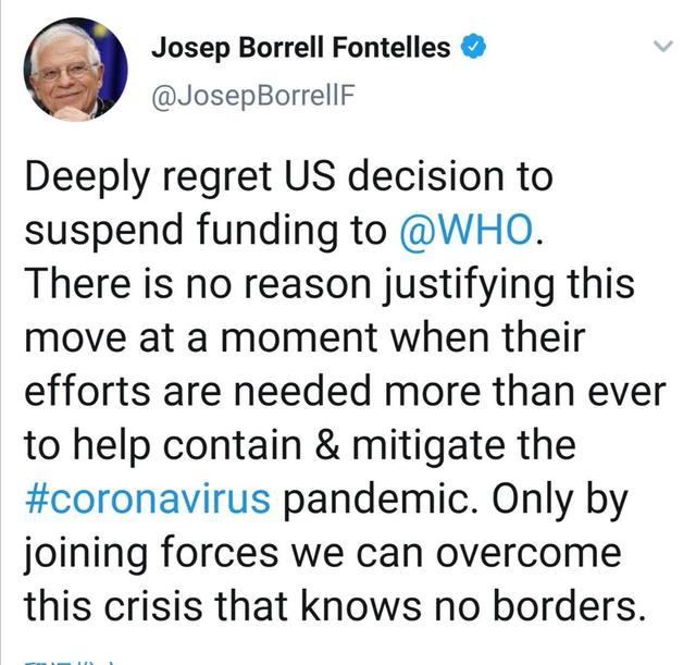 Josep Borrell, Alto Representante da UE para os Negócios Estrangeiros e a Política de Seguran?a, disse no Twitter que "lamentamos profundamente a decis?o dos EUA de suspender o financiamento à @WHO. N?o há raz?o que justifique essa medida em um momento em que seus esfor?os s?o mais necessários do que nunca para ajudar a conter e mitigar a pandemia de #coronavírus. Apenas juntando for?as, podemos superar essa crise que n?o conhece fronteiras ".