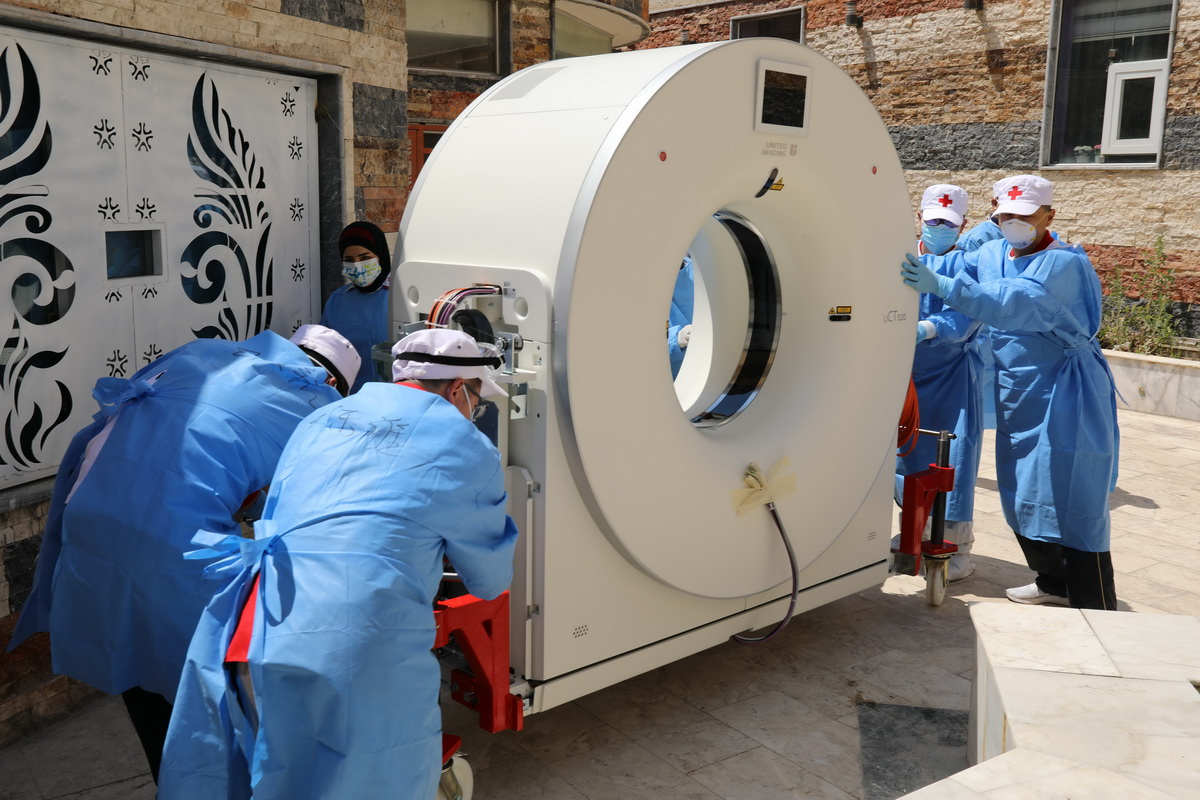 Membros da equipe médica chinesa instalam equipamentos de TC em Bagdá, no Iraque, em 12 de abril de 2020.