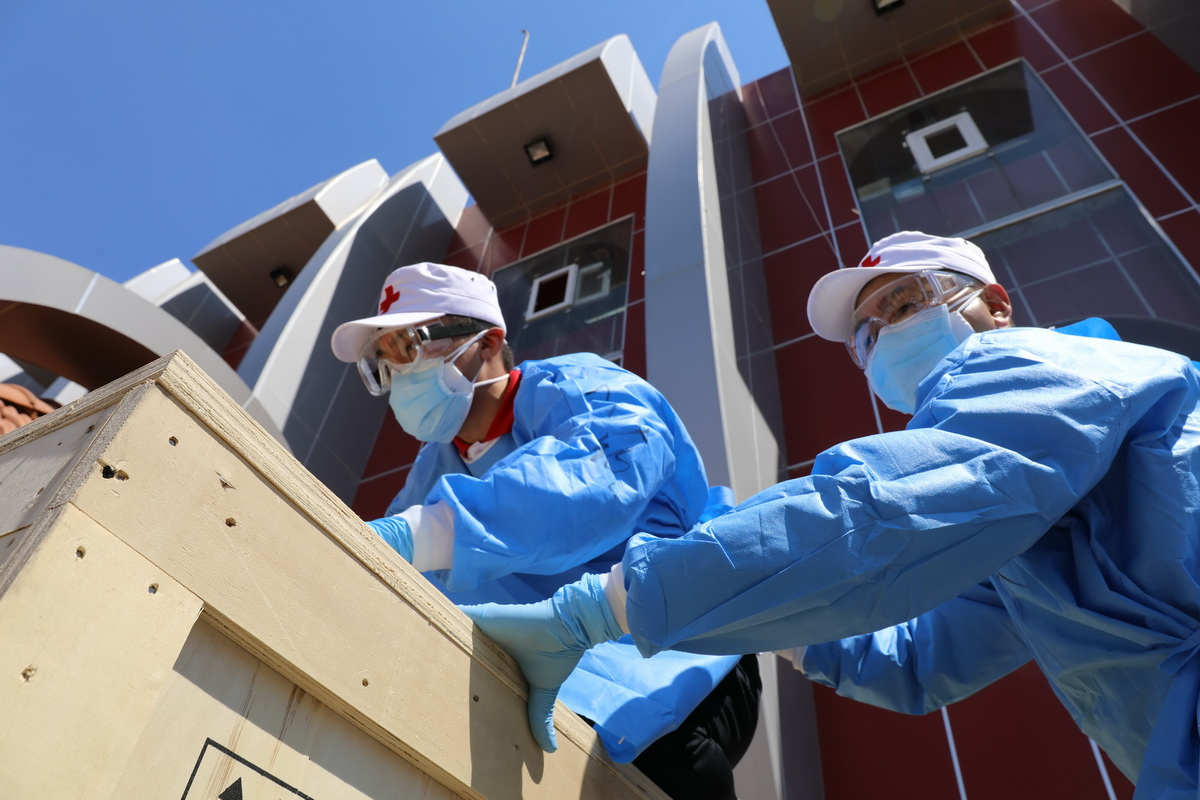 Wang Anming (E) e Tao Zhongquan, membros da equipe de especialistas chineses, abrem uma caixa de madeira contendo equipamentos de TC em Bagdá, no Iraque, em 12 de abril de 2020.