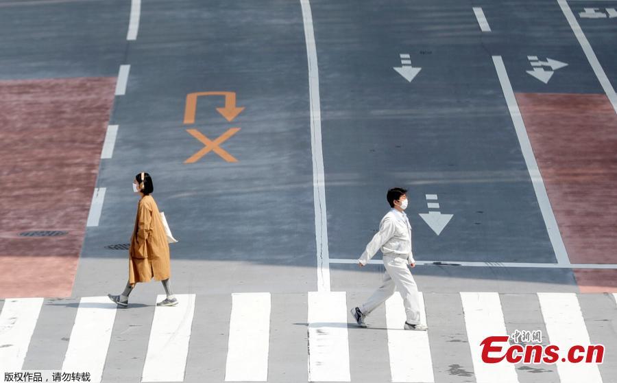 Pessoas que usam máscaras de prote??o atravessam uma rua quase vazia.