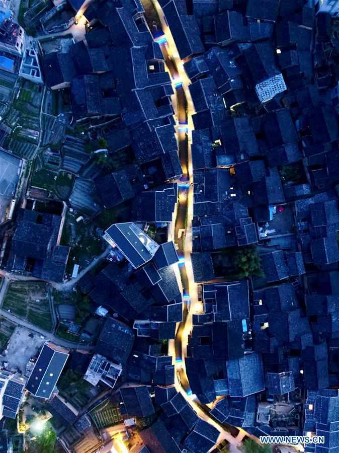 A foto, tirada em 17 de abril de 2020, mostra algumas residências antigas ao longo das margens de um riacho na antiga aldeia de Puyuan, na província de Fujian, no sudeste da China.