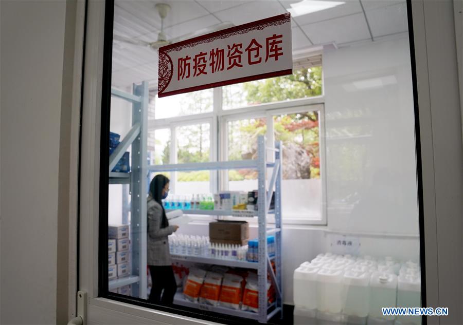 A foto mostra o armazém de material para preven??o e controle de epidemias em uma escola de ensino médio em Shanghai.
