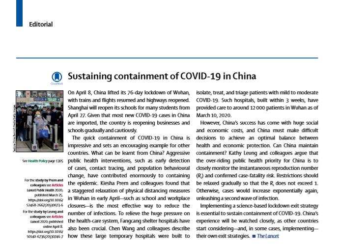 O editorial indica que a China está gradualmente e cuidadosamente repondo o normal funcionamento laboral e escolar, com base na implementa??o de uma estratégia científica de "desbloqueio" , para permitir a conten??o da epidemia. A experiência da China será observada de perto, à medida que outros países come?am a considerar e, em alguns casos, a implementar suas próprias estratégias.