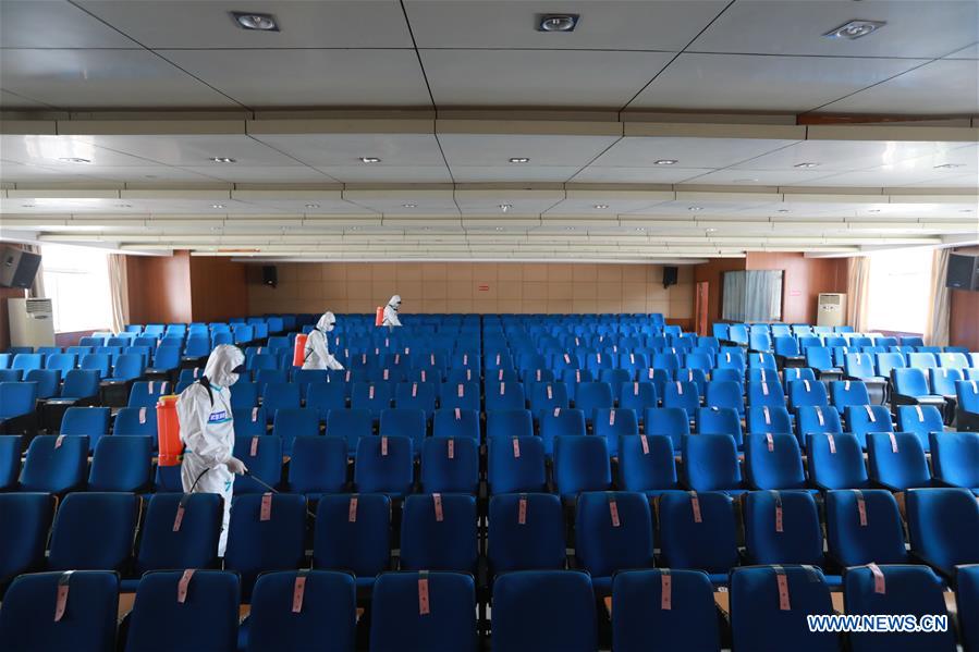 Bombeiros desinfetam o auditório da Escola de Ensino Médio No. 23 em Wuhan, província de Hubei, no centro da China, em 22 de abril de 2020.