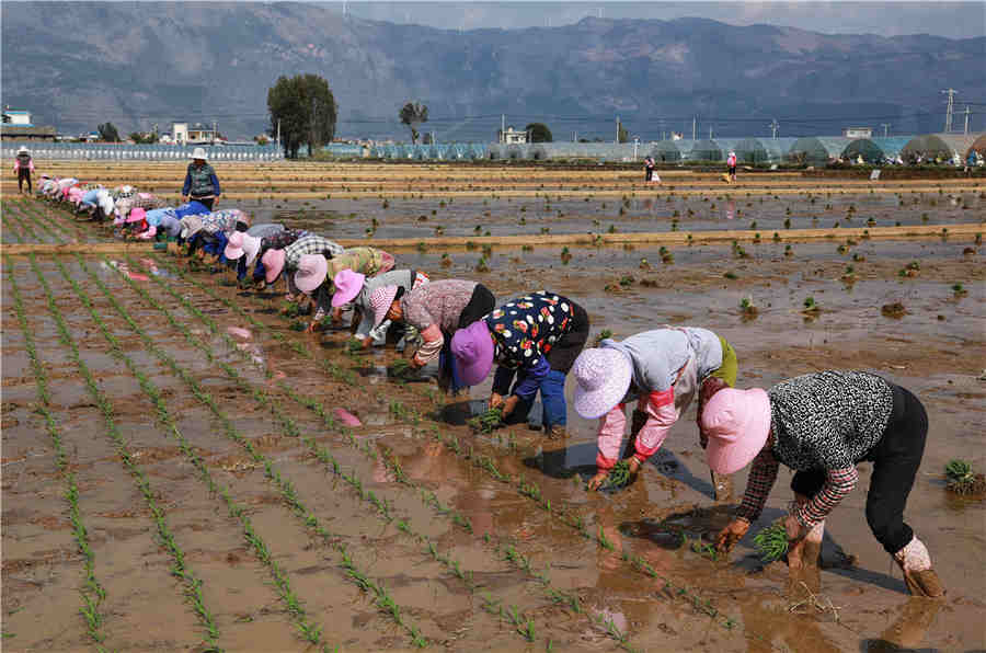 As agricultoras plantam mudas de arroz de acordo com o espa?amento designado em uma base de demonstra??o de arroz super híbrido na prefeitura aut?noma de Honghe Hani e Yi, província de Yunnan.