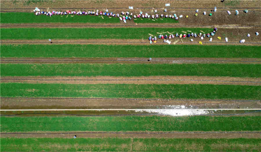 As agricultoras arrancam mudas de arroz em uma base de demonstra??o de arroz super híbrido.