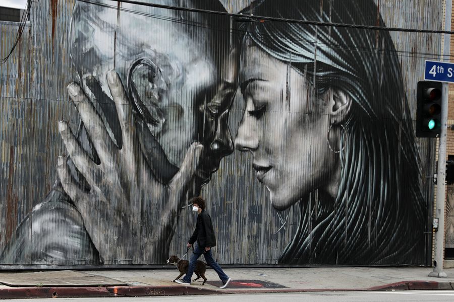 Um homem envergando uma máscara passeia o seu cachorro no distrito de Arte, no centro de Los Angeles, EUA, a 10 de abril de 2020.