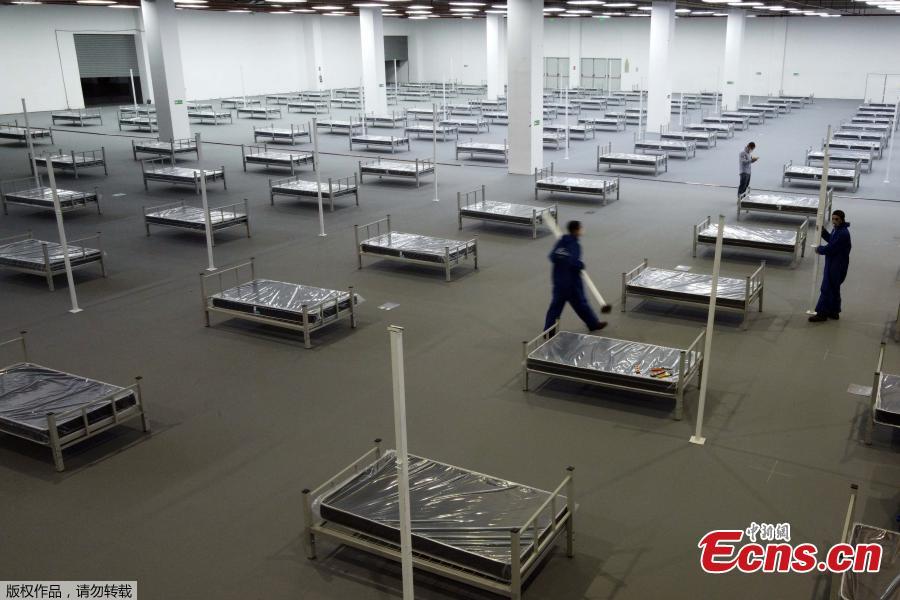Os trabalhadores equadorianos construíram um hospital de campanha com 370 leitos para pacientes infetados da Covid-19, em Quito, 23 de abril de 2020. O hospital foi instalado no Centro de Conven??es Bicentenario, na capital equadoriana.