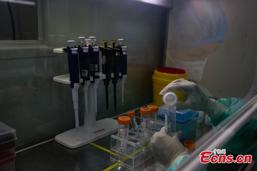 Um membro da equipe processa o chip de teste de ácido nucleico em um laboratório.