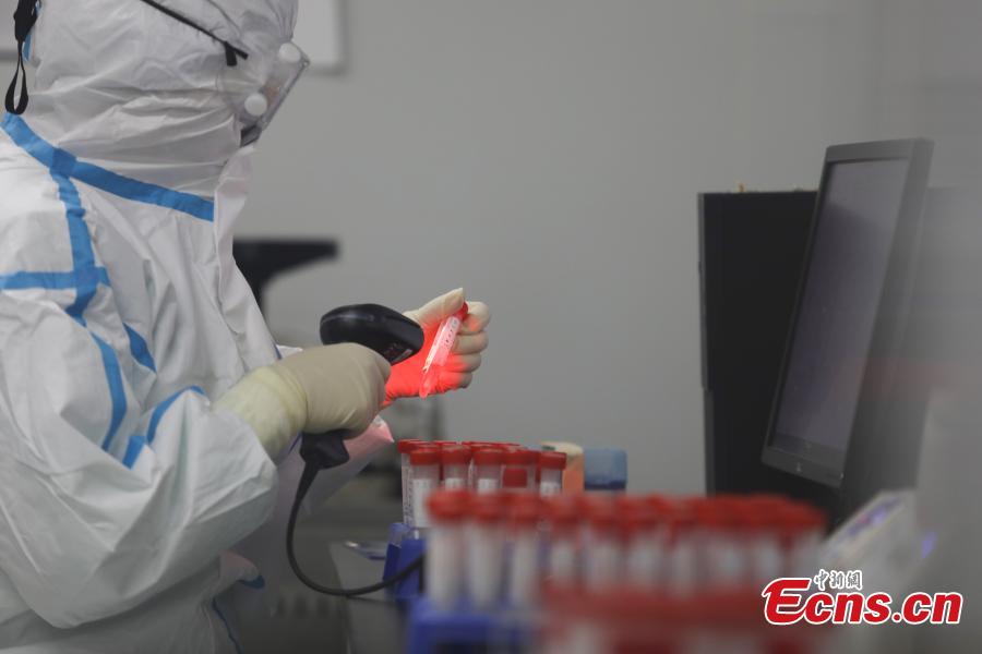 Um membro da equipe coleta informa??es através de escaneamento de tubos de amostra de ácido nucleico. à medida que mais pessoas voltam ao trabalho em Beijing, e a preven??o do novo coronavírus se torna cada vez mais normalizada, a necessidade de teste de ácido nucleico está crescendo.