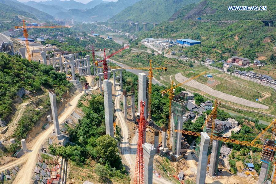 Foto aérea tirada em 2 de maio de 2020 mostra o local da obra da via expressa Chongqing-Zunyi, na província de Guizhou, no sudoeste da China.