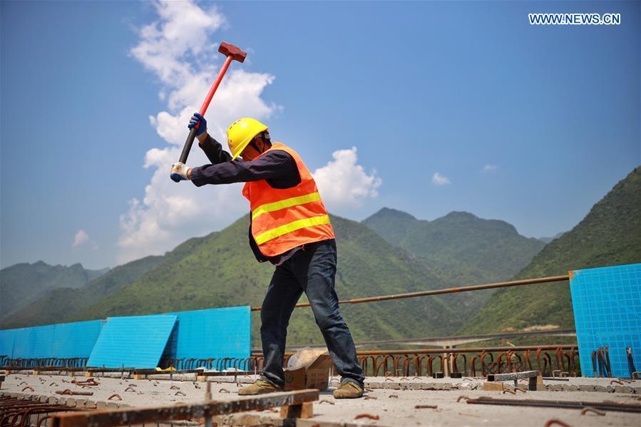 Um trabalhador no local de obra da via expressa de Chongqing-Zunyi, sudoeste da China, na província de Guizhou, em 2 de maio de 2020. Durante o feriado do Dia Internacional do Trabalho, os trabalhadores est?o acelerando a constru??o da via expressa sob medidas rigorosas de preven??o de epidemias.
