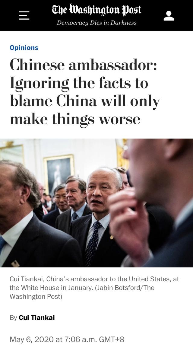 Um artigo do embaixador chinês nos Estados Unidos, Cui Tiankai, intitulado "Ignorar os fatos para culpar a China apenas irá piorar a situa??o", foi publicado no Washington Post na quarta-feira (6), onde é criticada a mentalidade de "culpar constantemente a China" durante a luta contra a Covid-19.