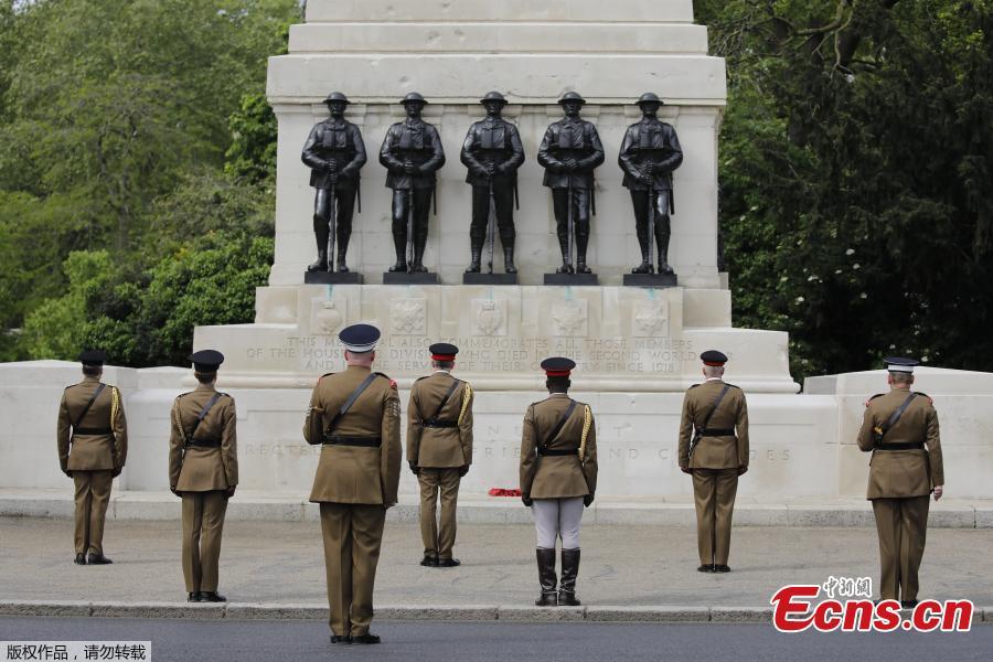 Oficiais e soldados da Divis?o Doméstica mantêm distanciamento social, enquanto fazem 2 minutos de silêncio para celebrar o 75o aniversário do Dia da Vitória na Europa, quando se deu o fim da Segunda Guerra Mundial na Europa, no Horse Guards Parade, St. James's Estacione no centro de Londres em 8 de maio de 2020.