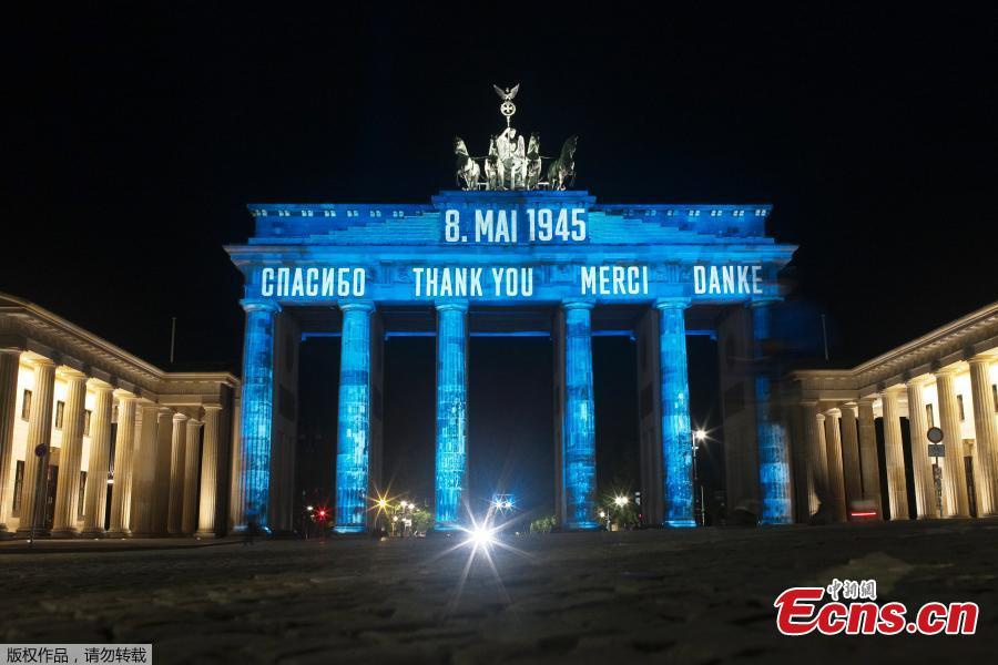 O marco da Alemanha, o Port?o de Brandenburgo é iluminado para marcar o 75oaniversário do Dia da Vitória e o fim da Segunda Guerra Mundial na Europa, em Berlim, Alemanha, a 8 de maio de 2020.