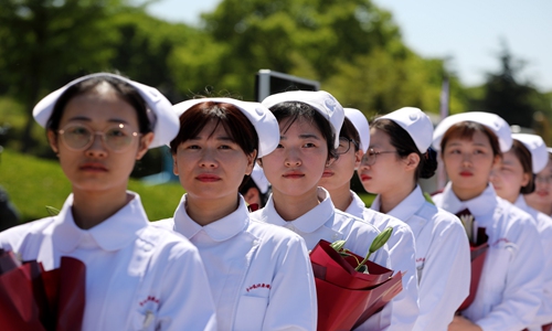 Vinte e duas enfermeiras, que ajudaram na batalha contra Covid-19 na província de Hubei, e outros médicos de diferentes hospitais de Shanghai comemoraram o 109o Dia Internacional das Enfermeiras em frente à estátua de Nightingale, no Parque de Oriental Land de Shanghai na ter?a-feira. Foto: Yang Hui / GT