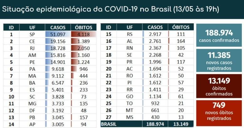às 8h do dia 14 de maio (hora de Beijing), o Brasil registou 11.385 casos confirmados e 749 mortes por coronavírus nas últimas 24 horas, totalizando 188.974 casos confirmados e 13.149 mortes desde o início da pandemia, segundo dados divulgados pelo Ministério da Saúde.