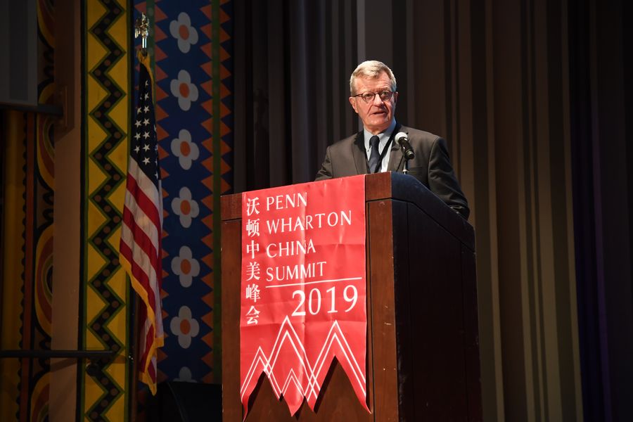 Foto tirada em 19 de abril de 2019, mostra Max Baucus, ex-embaixador dos EUA na China, falando na cerim?nia de abertura da “Penn Wharton China Summit” de 2019 na Filadélfia, Estados Unidos. (Xinhua / Yang Chenglin)