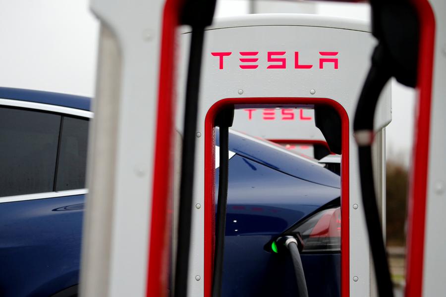 Um motorista recarrega a bateria de seu carro Tesla em uma esta??o de supercarregamento da Tesla, em um posto de gasolina na rodovia em Sailly-Flibeaucourt, Fran?a, em 12 de janeiro de 2019.