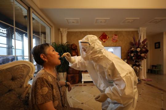 Um funcionário da equipe médica coleta com cotonete uma amostra de uma senhora para o teste de ácido nucleico no distrito de Hongshan em Wuhan, província de Hubei, 14 de maio de 2020. (Foto de Xue Zi / For China Daily)