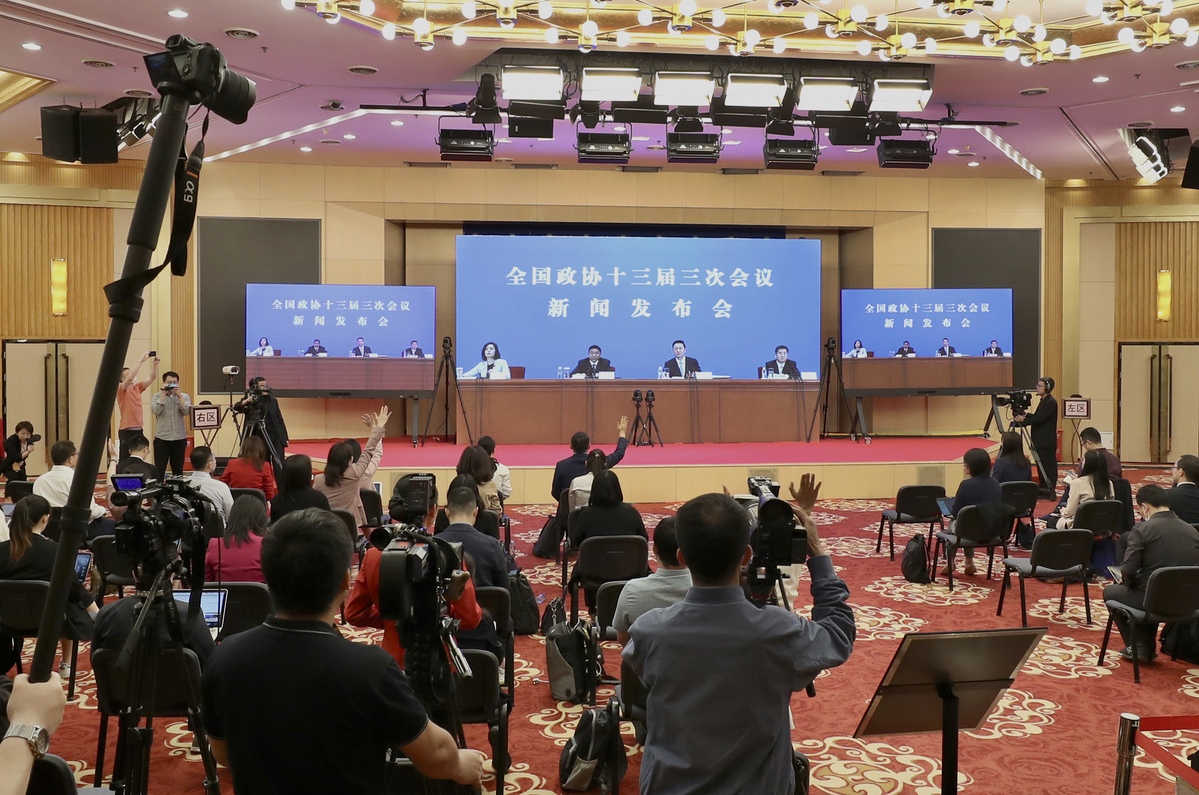 Uma coletiva de imprensa da terceira sess?o do 13o Comitê Nacional da Conferência Consultiva Política do Povo Chinês foi realizada em Beijing na quarta-feira, um dia antes da abertura da sess?o, e foi a primeira vez que uma coletiva de imprensa foi realizada por meio de link de vídeo nas duas sess?es, neste caso, como parte dos esfor?os preventivos da pandemia. Foto: Zou Hong / China Daily