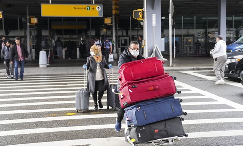 Passageiros desembarcam do Terminal 1 no Aeroporto Internacional John F. Kennedy em Nova York, Estados Unidos, em 13 de mar?o de 2020. A Casa Branca anunciou em 14 de mar?o que os Estados Unidos est?o estendendo as restri??es de viagens da Europa à Gr?-Bretanha e Irlanda devido à Covid- 19, entrando a medida em vigor na meia-noite de 16 de mar?o, horário padr?o. (Xinhua / Wang Ying)