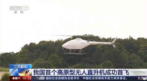 O primeiro helicóptero n?o tripulado desenvolvido na China, projetado para opera??es em planalto, realiza seu primeiro voo em Poyang, província de Jiangxi, leste da China, em 20 de maio de 2020. Foto: Captura de tela da Central de Televis?o da China (CCTV).