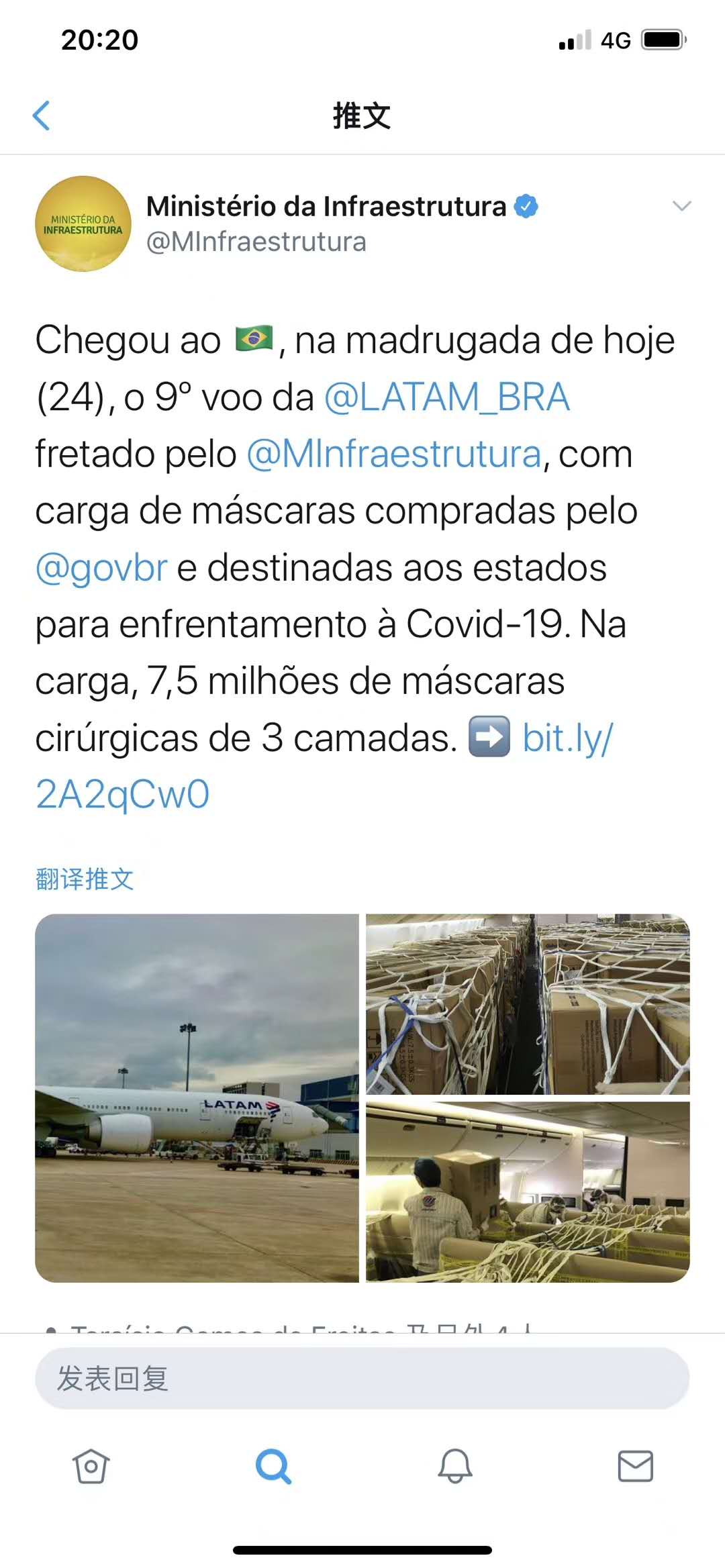 O Ministério da Infraestrutura do Brasil também afirmou que o país latino americano fretará um total de 40 voos e transportará 240 milh?es de máscaras da China para o Brasil.