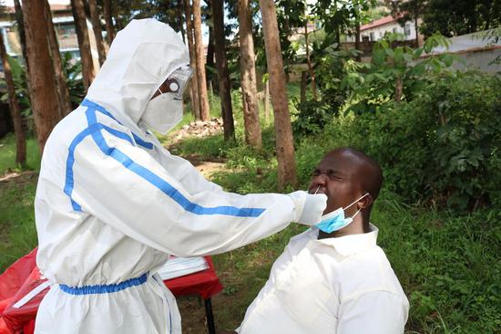 Um profissional de saúde (E) coleta amostras para o teste de Covid-19 na propriedade residencial Eastleigh em Nairóbi, capital do Quênia, em 21 de maio de 2020. (Xinhua/ Nyalwash)