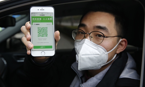 Um morador local mostra um código QR com o status de saúde pessoal em uma entrada de um conjunto habitacional em Hangzhou, capital da província de Zhejiang, leste da China, em 13 de fevereiro de 2020. Foto: cnsphoto
