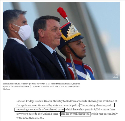 A prática do Ministério da Saúde do Brasil de deixar publicar o número total de casos confirmados no país causou indigna??o, em meio ao profundo aumento de novos casos que se tem verificado. Anteriormente o presidente Bolsonaro havia já amea?ado retirar o país da OMS, seguindo o encal?o dos EUA. O portal brasileiro UOL referiu no dia 6 que a “maquiagem” se havia tornado a nova estratégia contra a epidemia.