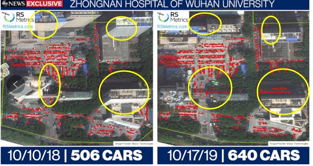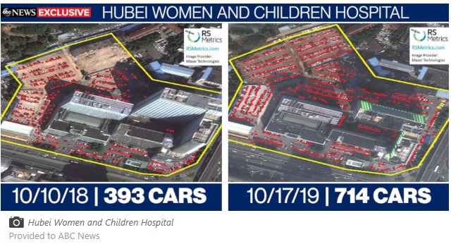 Os cientistas de Harvard extraíram os dados dos estacionamentos nos hospitais de Wuhan entre janeiro de 2018 e abril de 2020, detetando um aumento drástico no tráfego com início em agosto de 2019 e pico em dezembro.