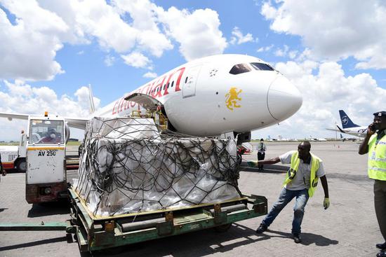 Um funcionário da autoridade aeroportuária puxa uma remessa de doa??o de equipamentos médicos para Covid-19 que foi doada pelas Funda??es Jack Ma e Alibaba ao Quênia, no Aeroporto Internacional Jomo Kenyatta em Nairobi, Quênia, 24 de mar?o de 2020. (Xinhua / John Okoyo)