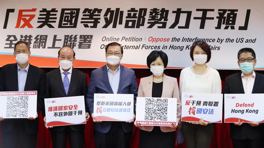 Hong Kong, 16 jun (Xinhua) -- Uma organiza??o de Hong Kong lan?ou nesta segunda-feira uma peti??o online em protesto à interferência das for?as estrangeiras lideradas pelos EUA nos assuntos internos da China e suas amea?as de impor san??es contra Hong Kong, após o órg?o legislativo nacional da China decidir fazer leis de seguran?a nacional para Hong Kong.