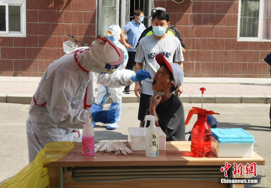 No dia 19 de junho, numa comunidade que implementa gerenciamento fechado no distrito de Xicheng, em Beijing, os funcionários fazem o teste de ácido nucleico para os residentes.
