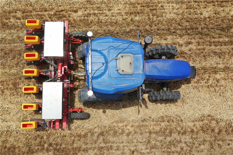 Um trator n?o tripulado equipado com um sistema de navega??o Beidou realiza semeadura na vila de Anzhong, em Dengzhou, província de Henan, em 26 de maio. O sistema ajudou a aumentar a produtividade em muitas áreas. (FENG DAPENG / XINHUA)