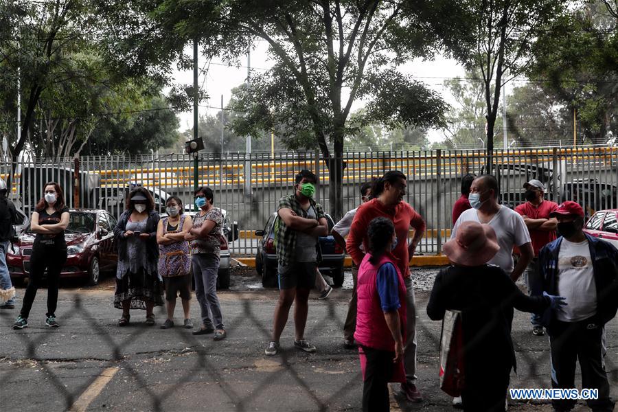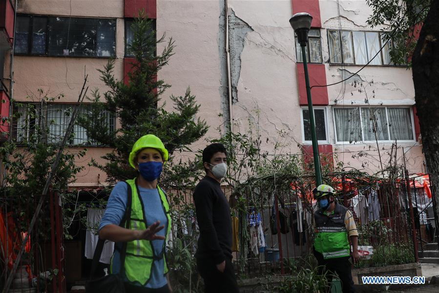 As pessoas usam máscaras enquanto aguardam do lado de fora de uma unidade habitacional após um terremoto, na Cidade do México, capital do México, em 23 de junho de 2020. Um terremoto de 7,5 graus de magnitude foi registrado às 10h29, horário local, localizado a 12 quil?metros a sudeste da cidade de La Crucecita, em Oaxaca (sudeste), a uma profundidade de 5 quil?metros. (Xinhua / Francisco Ca?edo)