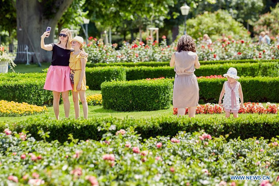 Os turistas tiram uma selfie durante sua visita ao centro da cidade de Viena, na áustria, em 27 de junho de 2020.