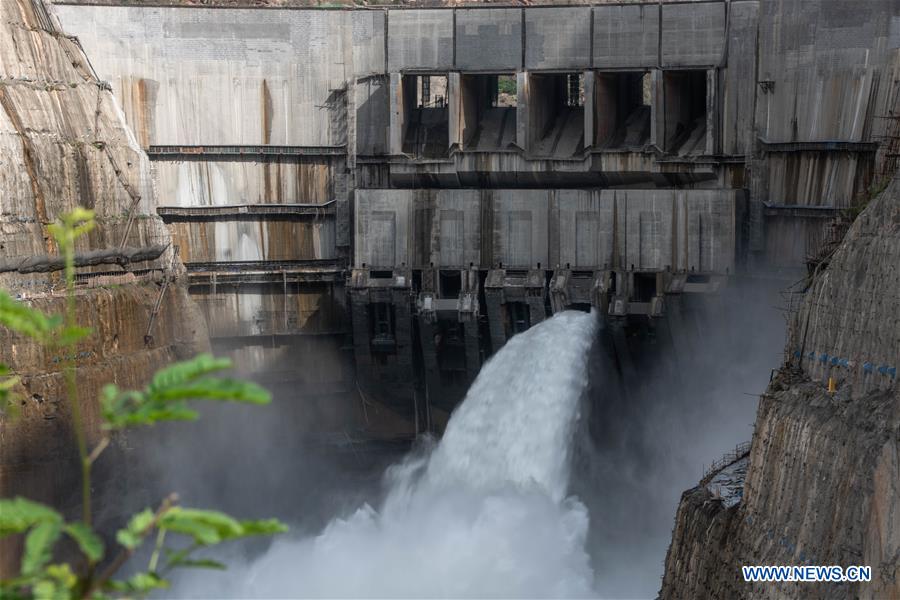 Foto tirada em 29 de junho de 2020 mostra a água jorrando de uma cal?ada da Usina Hidrelétrica Wudongde, na fronteira das províncias de Sichuan e Yunnan, no sudoeste da China.